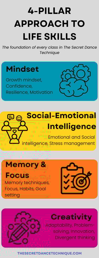 1. Life Skill Focus – Each class begins with a spotlight on the life skill focus of the day, drawn from one of the 4 Pillars: